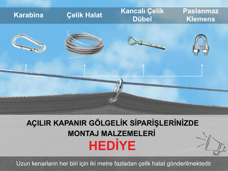 - Ekstra Çelik Halat: Ürünün uzun kenarları için fazladan 2 metre çelik halat gönderilecektir.